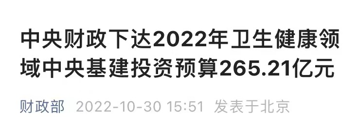 近日,據(jù)財(cái)政部官微消息,中央財(cái)政下達(dá)2022年衛(wèi)生健康領(lǐng)域中央基建投資預(yù)算265.21億元,推動(dòng)“十四五”102項(xiàng)重大工程和《“十四五”優(yōu)質(zhì)高效醫(yī)療衛(wèi)生服務(wù)體系建設(shè)實(shí)施方案》等任務(wù)落地。