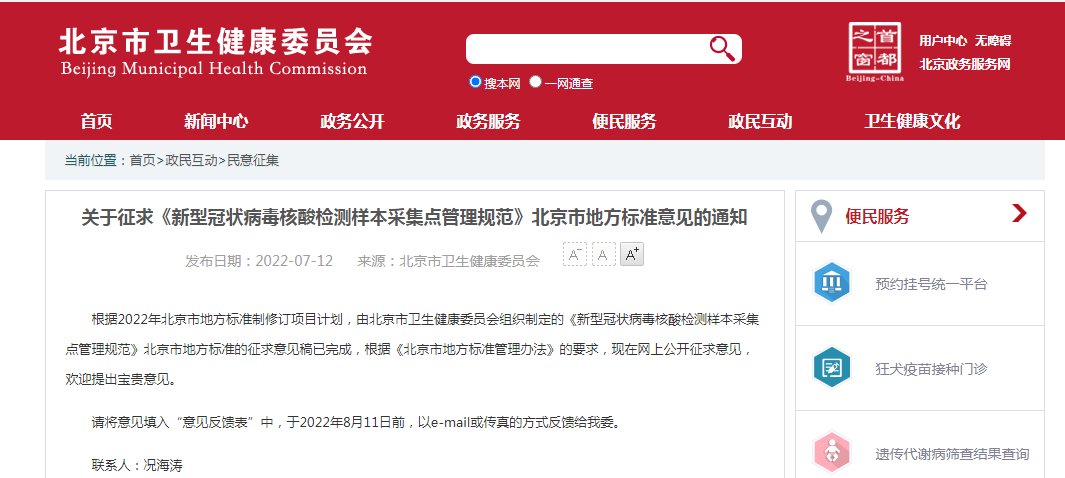 日前,據(jù)北京市市場監(jiān)督管理局網(wǎng)站消息,北京市衛(wèi)生健康委員會組織制定的《新型冠狀病毒核酸檢測樣本采集點管理規(guī)范》,說明了新型冠狀病毒核酸檢測樣本采集點的基本要求、采集點設置、設施設備及物品、人員要求、樣本采集、樣本保存及運輸、醫(yī)療廢棄物處理、環(huán)境消殺等多方面做出要求,指導北京的核酸采樣管理。