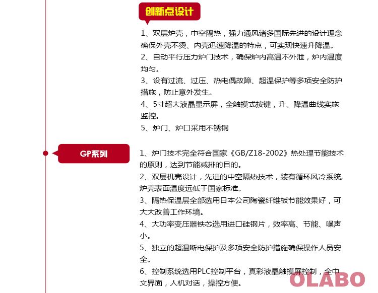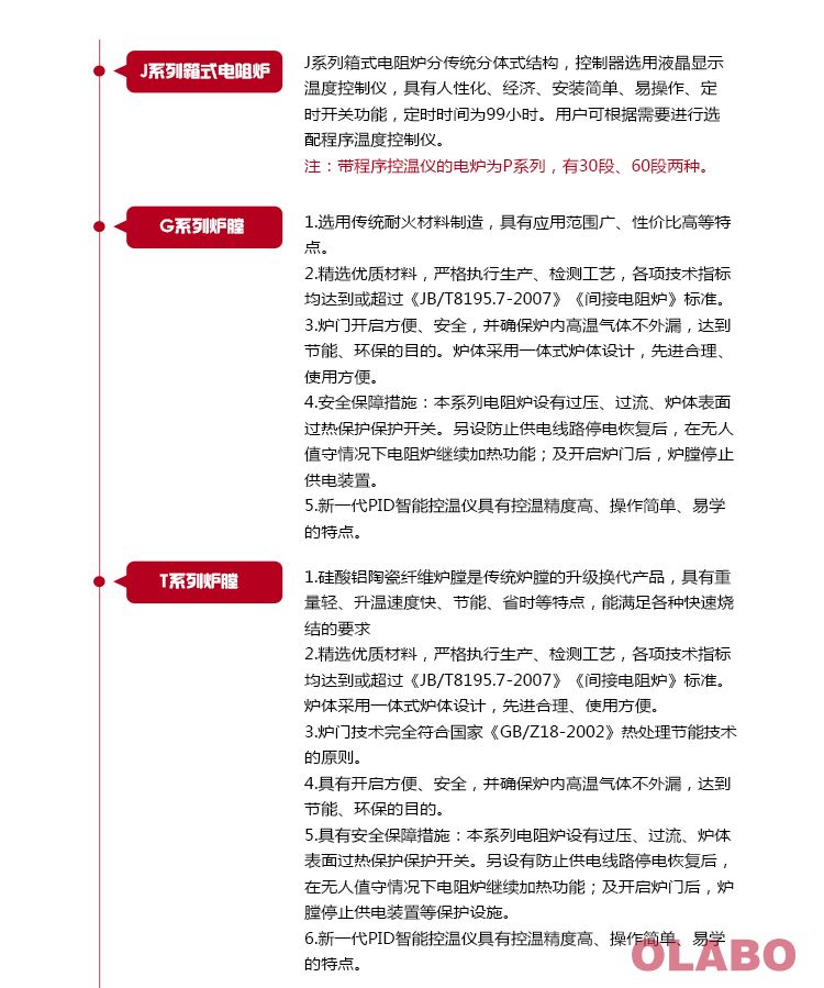 1、T系列爐膛---硅酸鋁陶瓷纖維爐膛是傳統(tǒng)爐膛的升級換代產(chǎn)品,具有重量輕、升溫速度快、節(jié)能、省時等特點,能滿足各種快速燒結(jié)的要求. 2、精選優(yōu)質(zhì)材料,嚴格執(zhí)行生產(chǎn)、檢測工藝4、爐門結(jié)構(gòu)采用全方位密封技術(shù)。具有開啟方便、安全,并確保爐內(nèi)高溫氣體不外漏,達到節(jié)能、環(huán)保的目的。 3、具有安全保障措施:本系列電阻爐設(shè)有過壓、過流、爐體表面過熱保護保護開關(guān)。另設(shè)有防止供電線路停電恢復后,在無人值守情況下電阻爐繼續(xù)加熱功能;及開啟爐門后,爐膛停止供電裝置等保護設(shè)施。 4、新一代PID智能控溫儀具有控溫精度高、操作簡單、易學的特點。